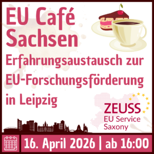 Die Zentrale EU-Serviceeinrichtung Sachsen (ZEUSS) ist ein Angebot an die öffentlich finanzierten Hochschulen, außeruniversitäre Forschungseinrichtungen sowie für weitere interessierte Akteur:innen in Sachsen. ZEUSS unterstützt Sie bei der Einwerbung von Mitteln aus Horizon Europe.