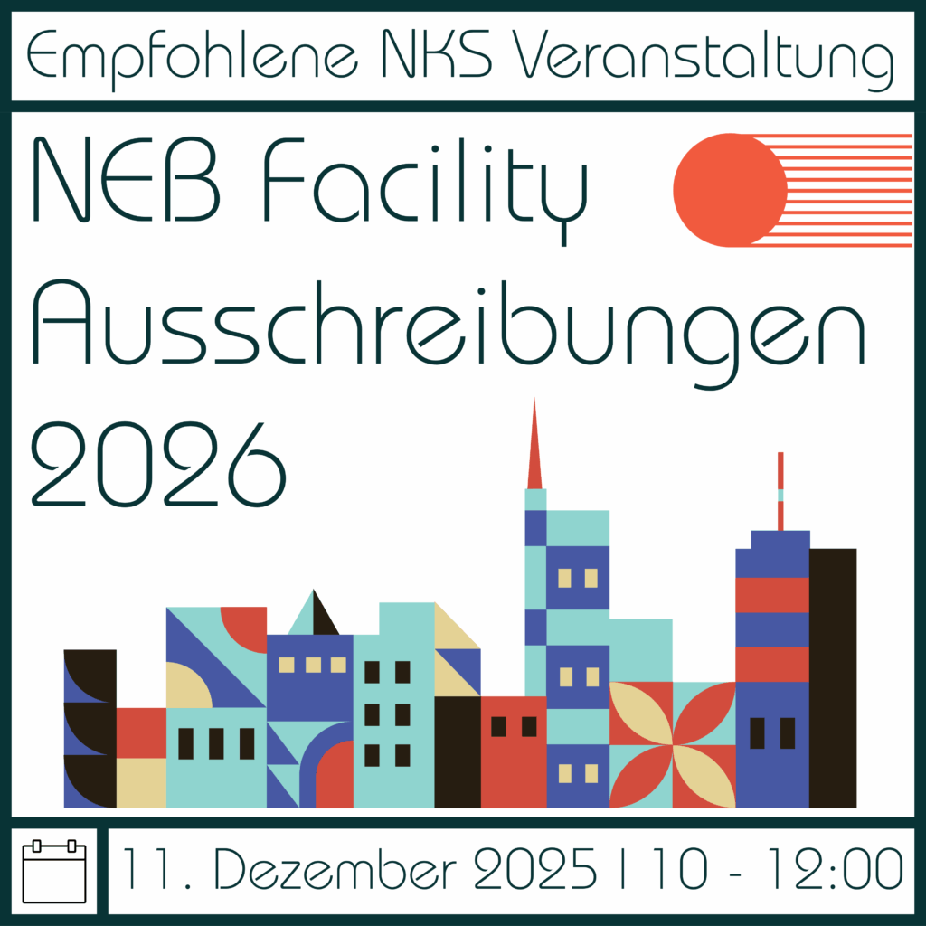 Die NKS NEB veranstaltet am 11. Dezember 2025 von 10:00-12:00 Uhr eine Online-Veranstaltung um über die Förderthemen der NEB Facility, insbesondere in Hinblick auf die Topics des Horizon Europe Arbeitsprogramm 2026, zu informieren sowie einen Ausblick auf das darauffolgende Jahr zu geben.