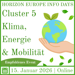 Am 15. Januar findet der Online-Infotag zu Cluster 5 „Klima, Energie und Mobilität” statt. Schalten Sie ein, um mehr zu erfahren über: Info zu den Cluster 5 Topics für 2026…